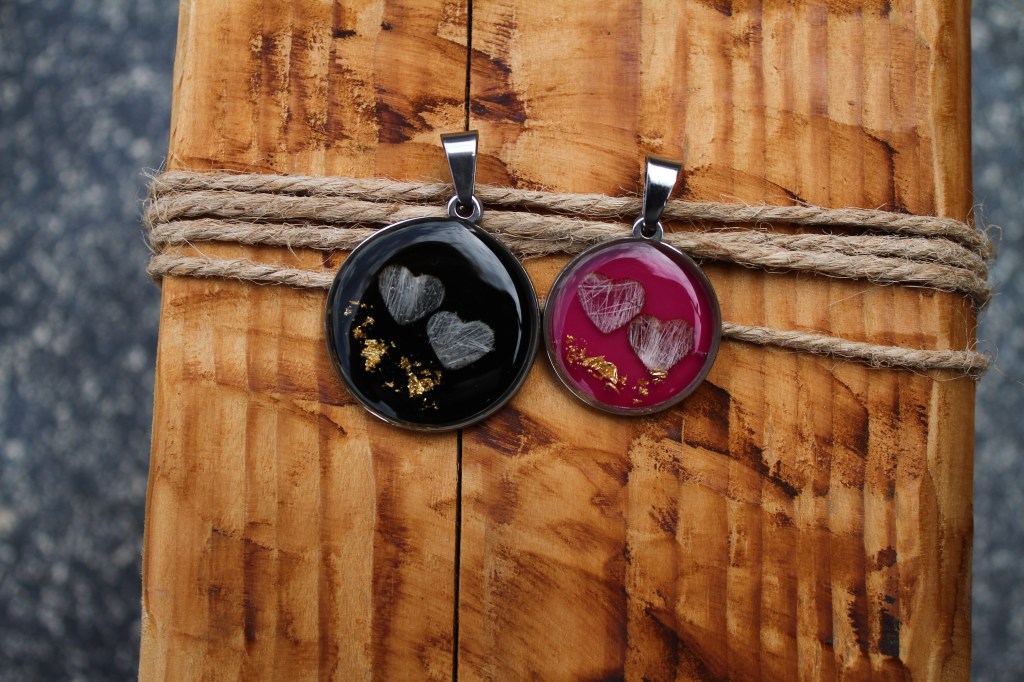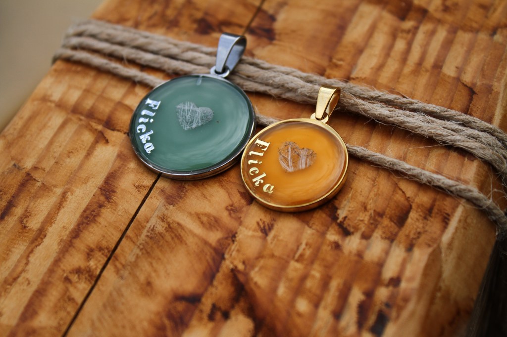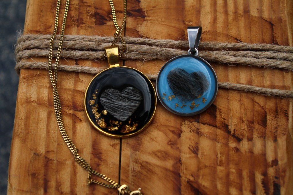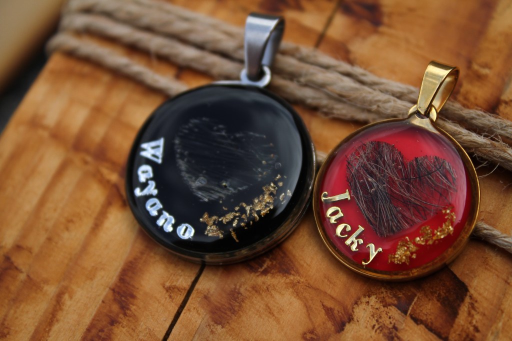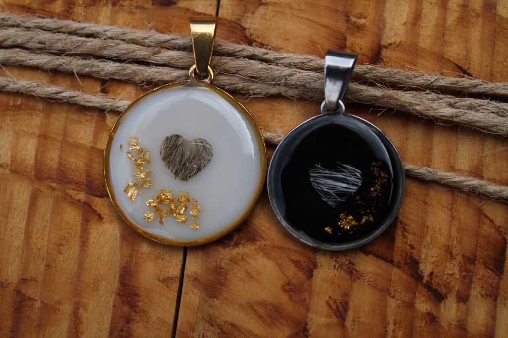 50€ – 2 kleine Herzen aus Haar oder Asche -Blattgold flocken -Name auf der Vorderseite in Silber oder Gold -Allgemeines beachten!