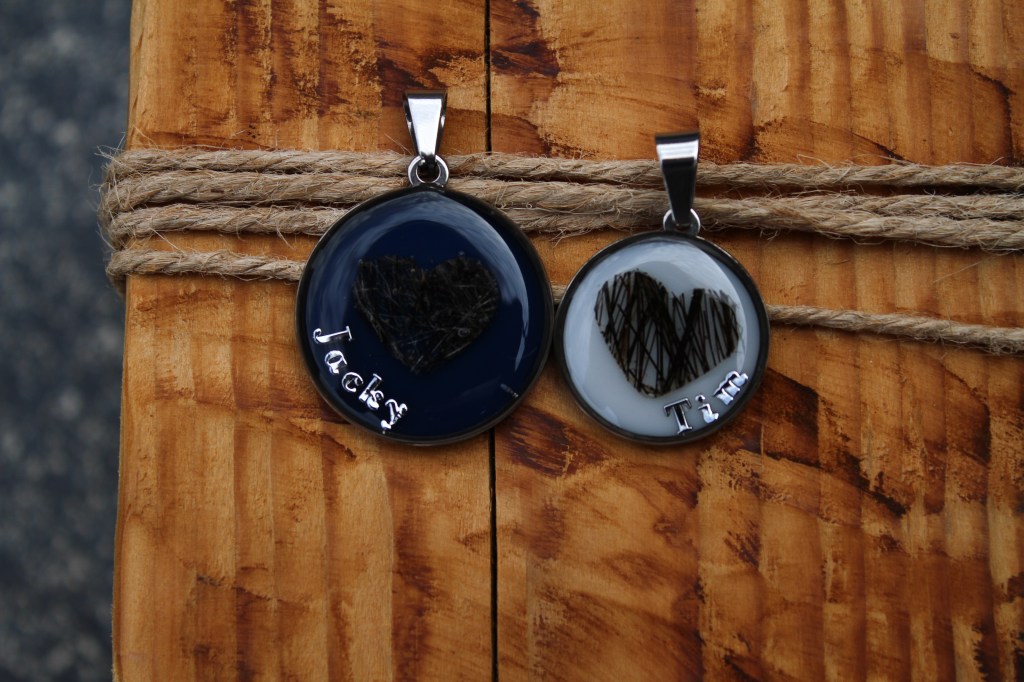 50€ – 2 kleine Herzen aus Haar oder Asche -Name auf der Vorderseite in Silber oder Gold -Allgemeines beachten!